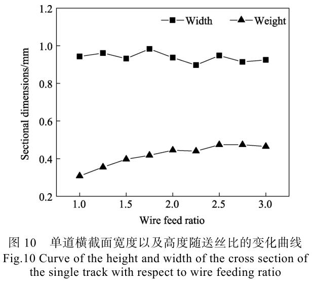 橫截面寬度以及高度隨送絲比的變化曲線如圖10 所示。可以看出,在不同送絲比情況下,橫截面寬度無明顯差異,寬度均值為 0.938 mm,標準差為0.025 mm。這主要是由于沉積層的寬度會受到熔池寬度的影響,而送絲比對熔池形狀幾乎無影響,因此沉積層寬度也不會有較大差異,絲材質量的增大主要體現在沉積層高度方向上。隨著送絲比從 1 增大至 3,單道沉積層的高度從 0.308 mm 增大至 0.465 mm,增大了 51.0%。