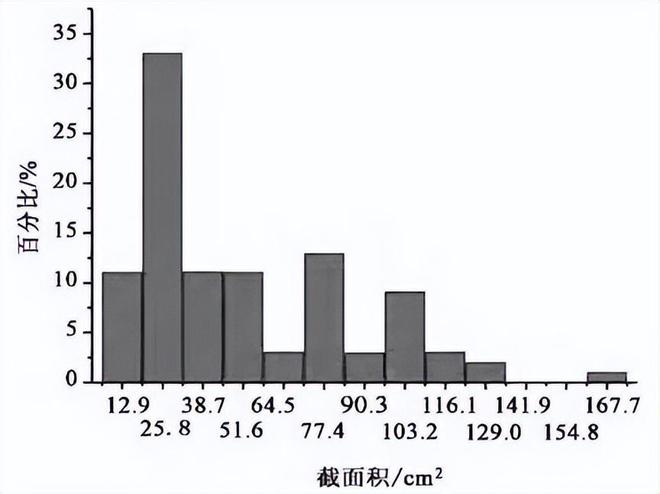 美國ATI公司對航空領域使用的鈦合金擠壓型材進行統計分析,發現目前航空領域所用鈦擠壓型材的截面面積分布情況如圖2所示,可以看出,大部分為中小截面積的擠壓型材。