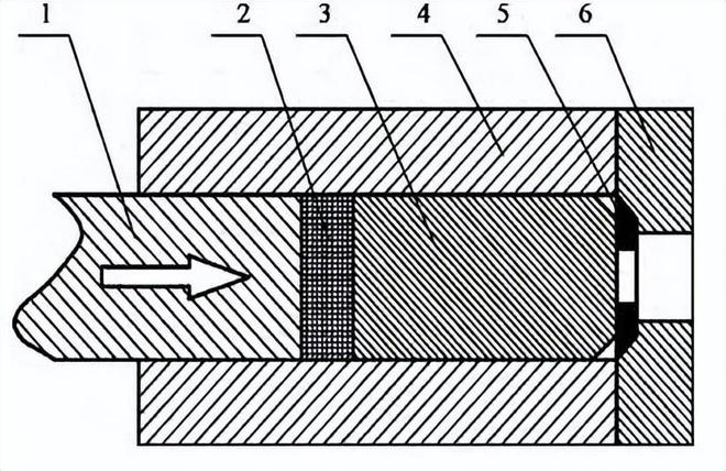 1.擠壓桿2.擠壓墊3.坯料4.擠壓筒5.玻璃潤滑墊6.擠壓模芯