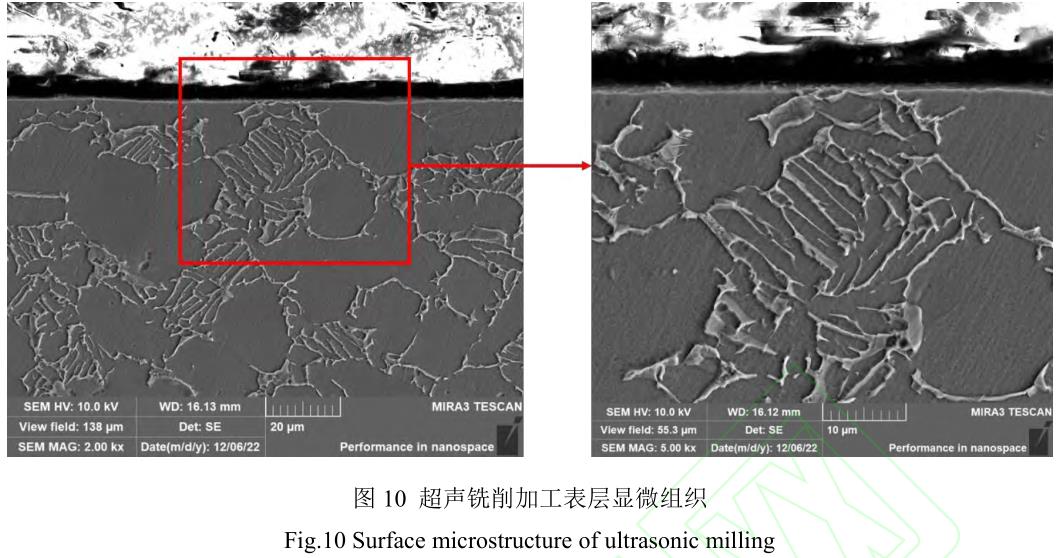 掃描電子顯微鏡(SEM)下觀測超聲沖擊加工后的加工面。銑削過程中銑削力、擠壓摩擦和加工熱都會促使試件表面顯微組織發生變化,而超聲沖擊過程中法向沖擊力和切向擠壓也會使得鈦合金顯微組織細化和變形。銑削加工面如圖10所示,可以看到銑削加工后,相較于深層組織,鈦合金試件表面組織出現塑性滑移,晶粒扭曲,但是變形層深度較淺(5μm以內)。在5000倍電鏡下,銑削加工面存在凹凸不平。作為對比,超聲沖擊則很好的起到了“削峰填谷”作用(圖11),使得加工面相對于銑削工藝更加平整。同時,超聲沖擊試件中的鈦合金α相被擠壓、細化,沿著加工方向定向傾斜、塑性流動,表層生成了更多的片狀β相組織。參照式1,表層更小的晶粒意味著更大的強度,與前文中觀察到的表面硬化現象吻合。超聲沖擊中多因素共同引起的塑性變形造成位錯和晶界的畸變,增加位錯密度和晶界面積,從而阻礙位錯和晶粒的滑移,增加材料的強度和硬度。圖11中可見超聲沖擊強化后塑性變形層深度在15-20μm,塑性變形層中的晶粒細化會帶來試件強度和硬度的提高,該工藝起到了較好的表面強化作用。