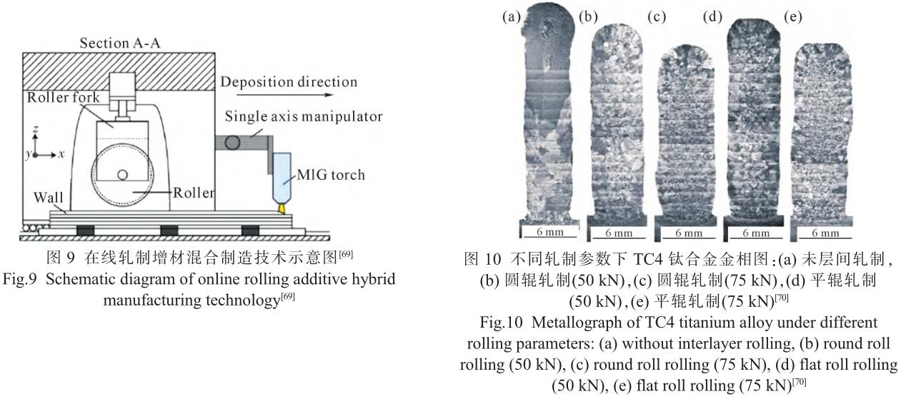 由于增材制造過程中會形成不均勻的溫度場,從而導致TC4鈦合金形成了粗大的柱狀晶,這些晶粒的尺寸甚至會達到毫米級,嚴重影響了構件的整體性能,因此提出了軋制增材混合制造技術。在線軋制混合制造技術是一種增材沉積和軋制交替進行的技術,其示意圖如圖9所示[69]。在線軋制的優點在于實現晶粒細化的同時降低了殘余應力和變形,可以極大地改善構件力學性能上的各向異性。相比于傳統的軋制技術將鑄造、軋制分離為兩個部分,在線軋制增材混合技術將增材與軋制工藝結合為簡化為一個步驟,不僅可以提升成形效率,還可以通過層間的軋制更好地控制整體構件的質量。